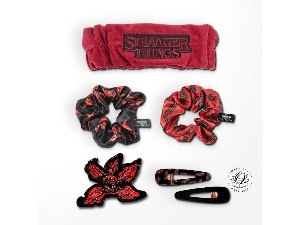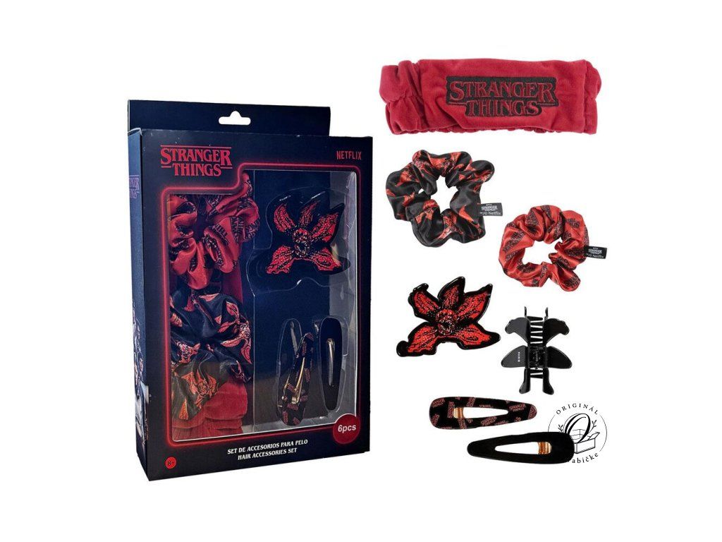 Sada vlasových doplnkov Stranger Things (6 ks): originálna sada, ktorá obsahuje látkové gumičky a štýlové sponky s motívmi Demogorgona a nápisom Stranger Things. Ideálny doplnok pre fanúšičky, ktoré chcú doladiť svoj outfit do štýlu 80. rokov. Oficiálne licencovaný produkt (Netflix). Odporúčame šetrné ručné čistenie, aby sa predišlo poškodeniu potlače a materiálu.