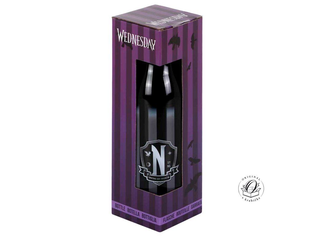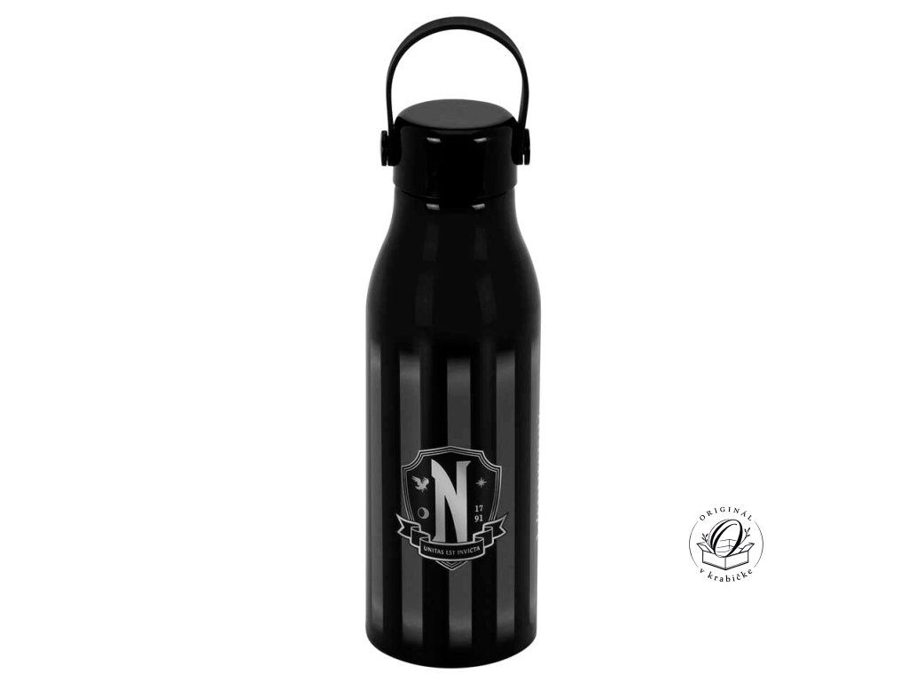 Hliníková fľaša Wednesday: ľahká a odolná fľaša v matnom čiernom prevedení s ikonickým motívom. Skrutkovací uzáver s praktickým náustkom. Materiál: hliník, plast. Oficiálne licencovaný produkt. Nevhodná do umývačky riadu a mikrovlnnej rúry. Odporúčame ručné umývanie šetrným čistiacim prostriedkom, aby sa zachovala sýtosť farieb a integrita potlače.